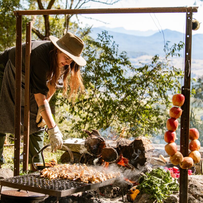 Begin the day high above the valley at Wild Mountains Environmental Education Centre for the Vegetarian Fireside Feast. A guided rainforest walk leads into a campfire cooking experience and long lunch, showcasing seasonal produce against sweeping Scenic Rim views.